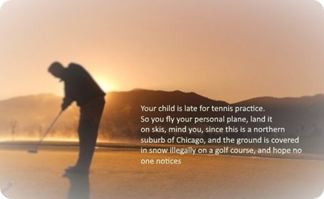 This is parenting in 2016: Your child is late for tennis practice. So you fly your personal plane, land it — on skis, mind you, since this is a northern suburb of Chicago, and the ground is covered in snow — illegally on a golf course, and hope no one notices. Like a modern-day Charles Lindbergh, you heroically fly in, delivering your offspring to an informal practice, scheduled before team tryouts later in the week. Seriously.
